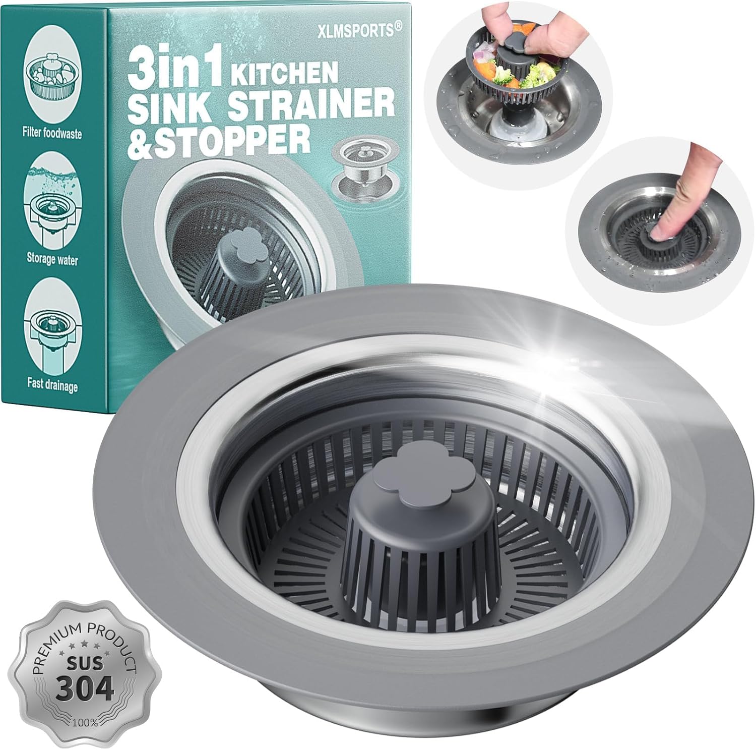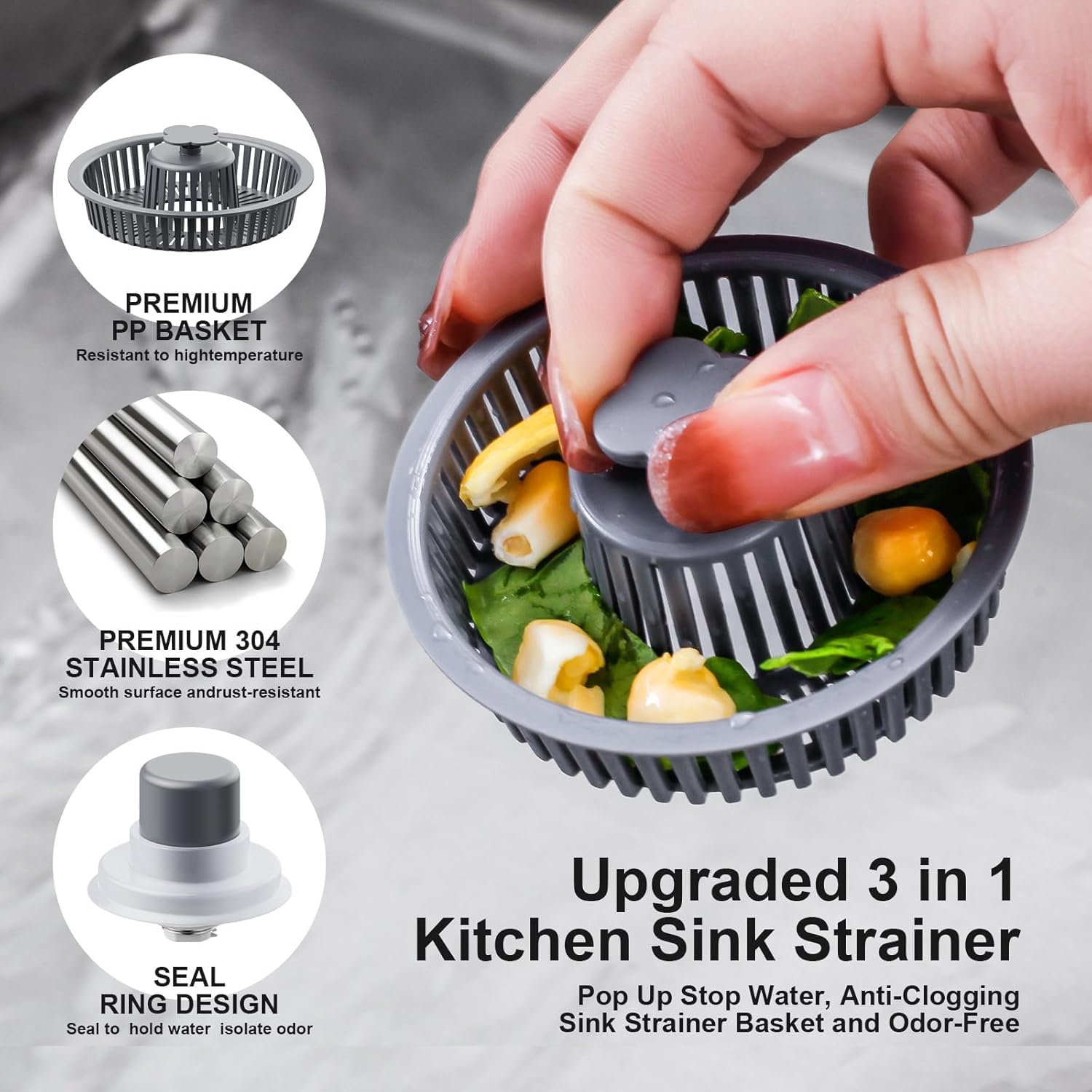 - 【Anti-Clogging Strainer Basket】 3 in 1 Kitchen Sink Drain Strainer and Stopper The kitchen sink drain strainer with appropriate basket hole design, can easily filter kitchen leftovers without clogging the basket holes, effortless garbage disposal for kitchen sink, without clogging up the sink drain & getting hands dirty. Waterproof and oil-resistant/heat-resistant PP material allows for easy cleaning and maintain, saving you time and effort.